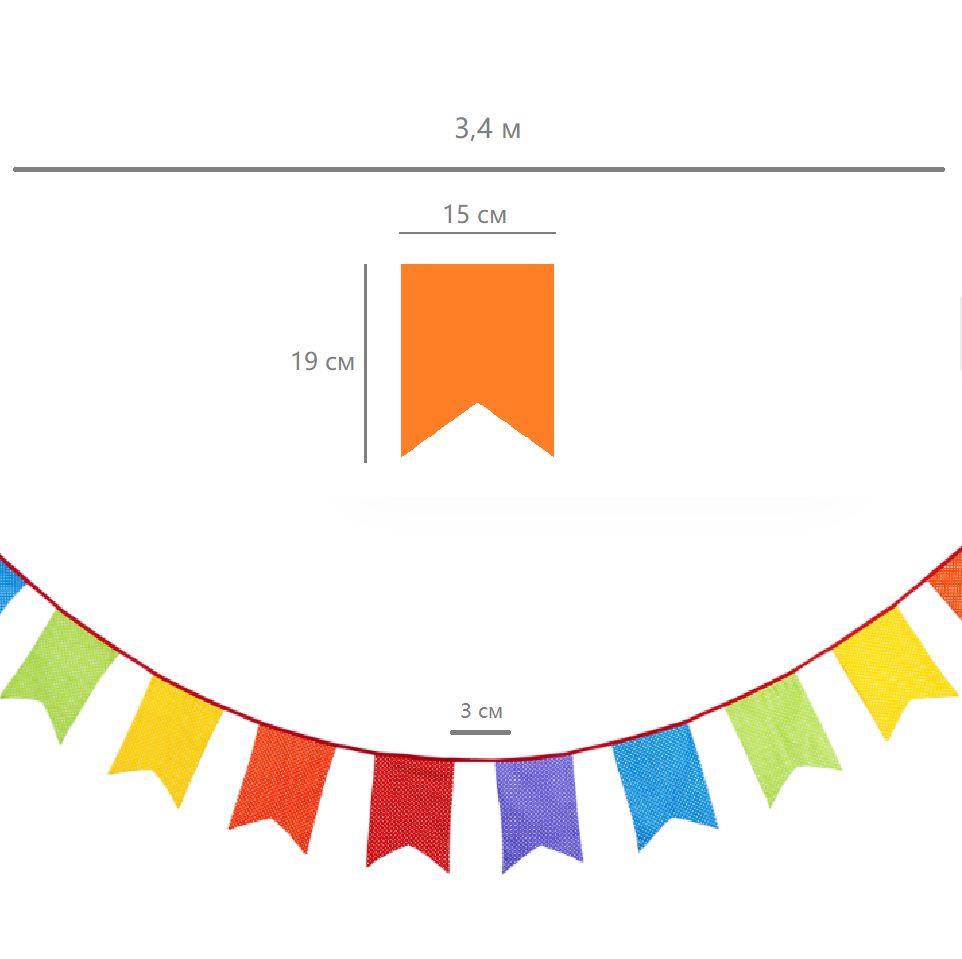Гирлянда состоит из 12 флажков, общая длина составляет 3,4 м, расстояние между флажками 3 см, длина матерчатых флажков 2,1 м, длина лямок с обеих сторон по 50 см
