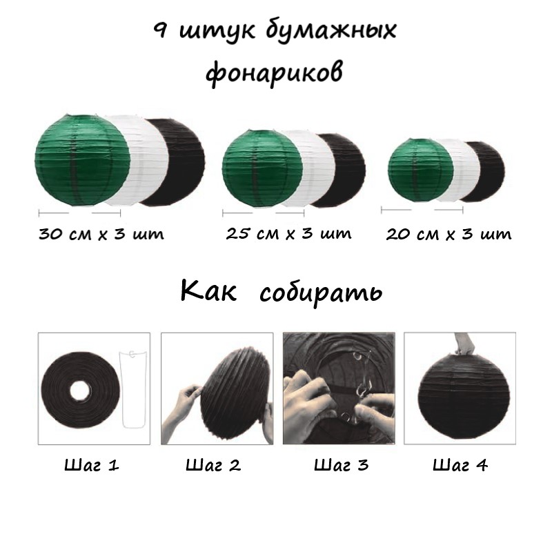 Набор подвесные фонарики 9 шт, белый+черный+т.зеленый