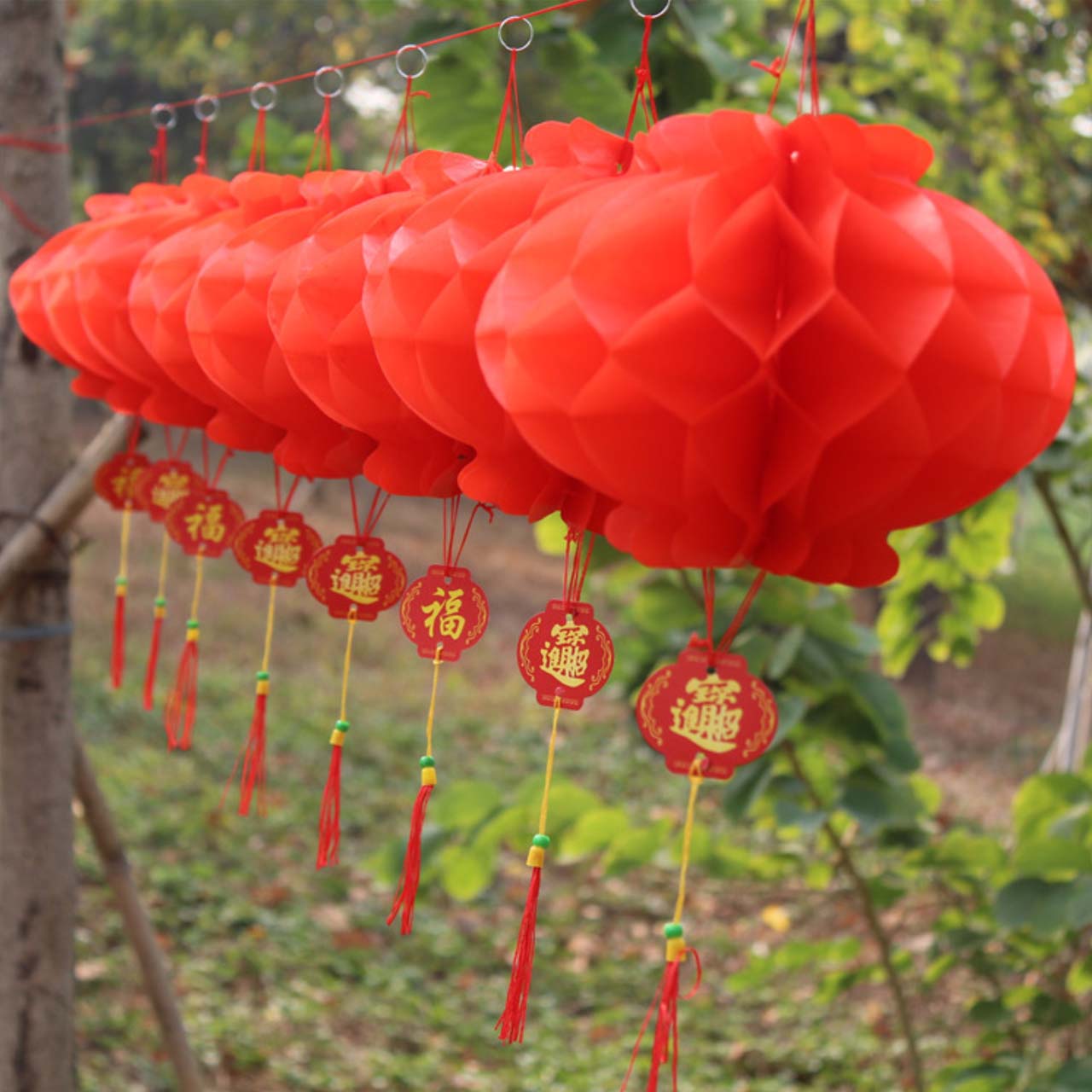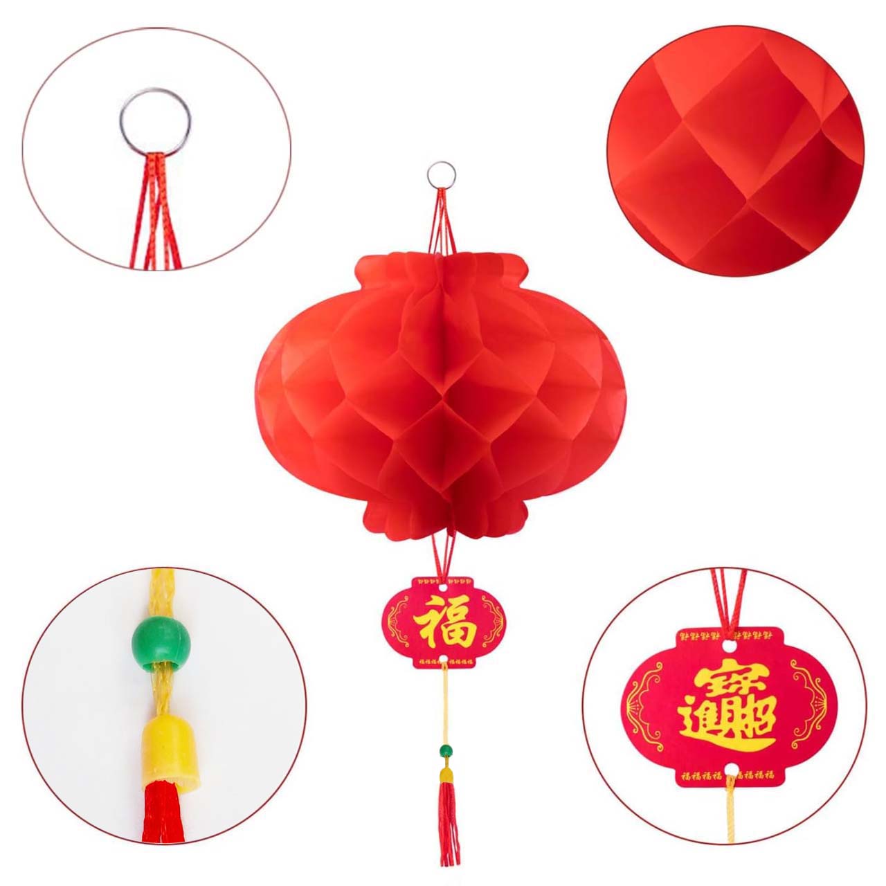 Простота в использовании: Бумажные фонарики имеют форму пчелиных сот с плотными отверстиями, их легко разворачивать и сворачивать. Раскройте концы и склейте их вместе (белая липкая двусторонняя лента на одном конце). Красный бумажный фонарь с кольцом и веревкой сверху легко подвешивается и снимается.
